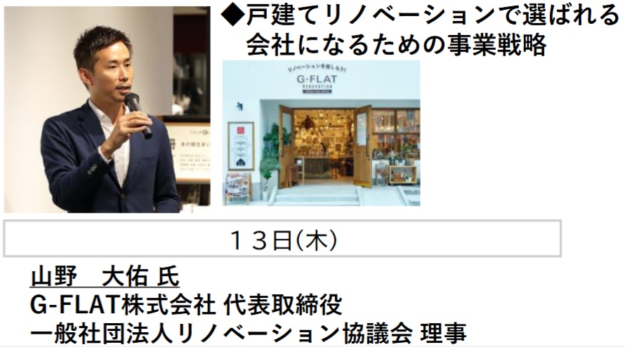 代表取締役山野大祐氏が登壇。「戸建てリノベーションで選ばれる会社になるための事業戦略」と題して、リノベーション事業で成功し続ける秘訣をお話しいただきます。