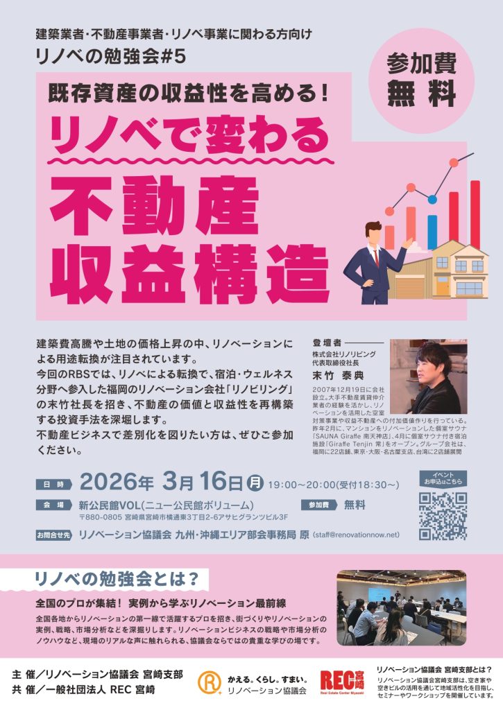3/16(月)リノベの勉強会#5「リノベで変わる不動産収益構造」宮崎RBS