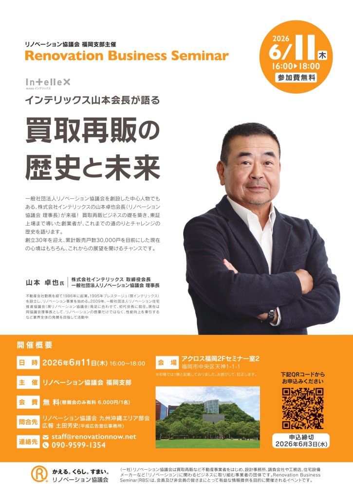 一般社団法人リノベーション協議会を創設した中心人物でもある、株式会社インテリックスの山本卓也会長(リノベーション協議会 理事長)が来福!買取再販ビジネスの礎を築き、東証上場まで導いた創業者が、これまでの道のりとチャレンジの歴史を語ります。